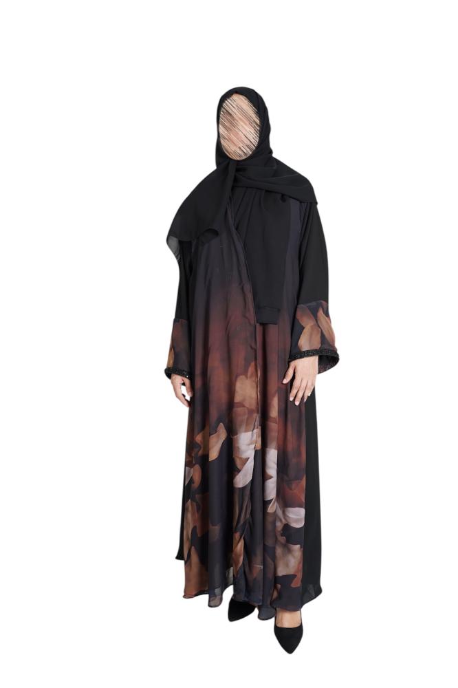 نوع القماش :قماش شيفون مطبوع ورد من الأمام .قماش بلاك بيري من الخلف.الملحقات : طرحة لون أسود سادة .نوع القصة : كلوش
